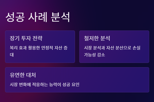 - 복리 효과를 활용한 장기 투자를 통해 안정적으로 자산을 증대시킨 사례들이 많습니다.