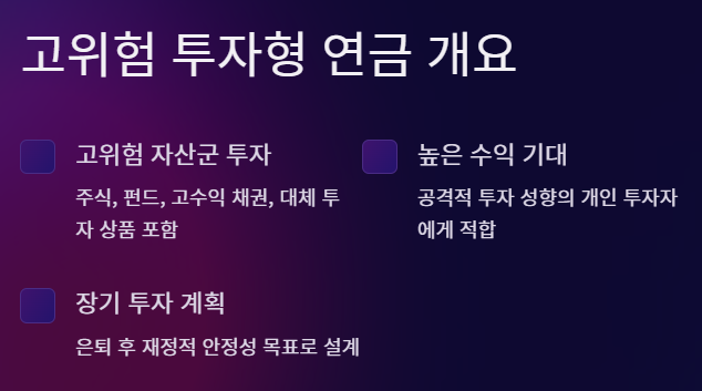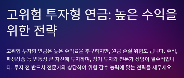 - 고위험 투자형 연금은 장기적인 투자 계획을 가진 투자자들에게 더 적합하며, 은퇴 후 재정적 안정성을 목표로 설계됩니다.