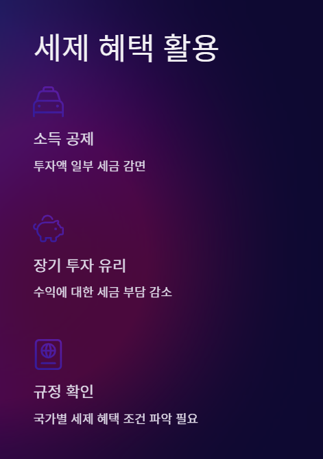- 단, 세제 혜택은 국가별로 다르기 때문에 투자 전 반드시 해당 규정을 확인하는 것이 중요합니다.