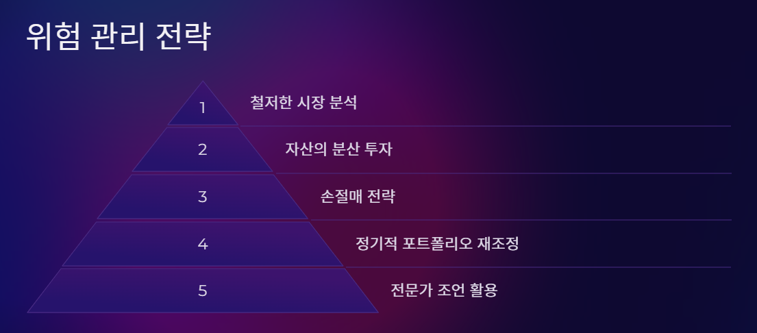- 철저한 시장 분석: 투자 전에 경제 지표, 산업 전망, 개별 자산의 특성을 분석하여 위험 요소를 파악하는 것이 중요합니다.