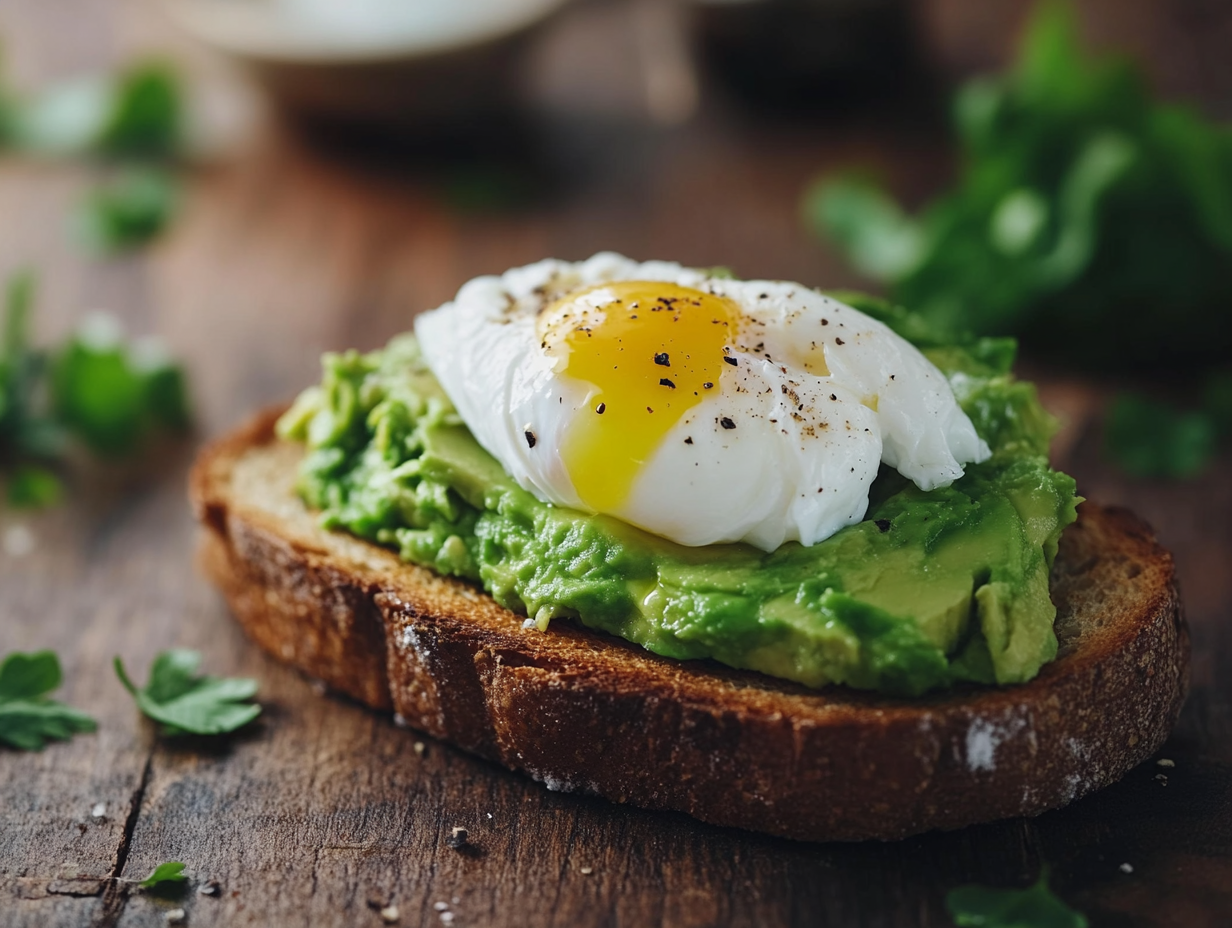 - 아보카도 토스트: 통곡물 빵에 으깬 아보카도를 바르고 계란, 토마토, 루꼴라를 올려보세요.