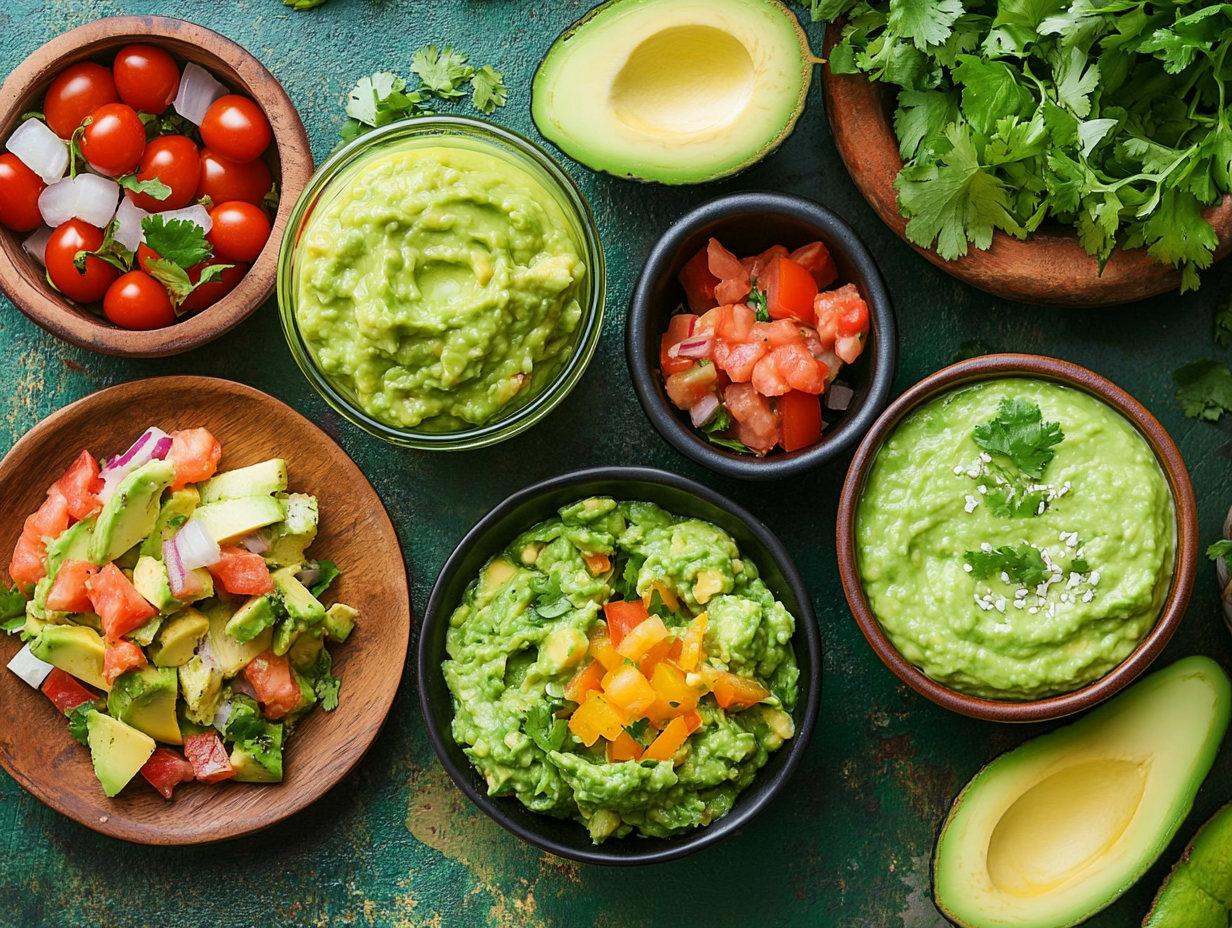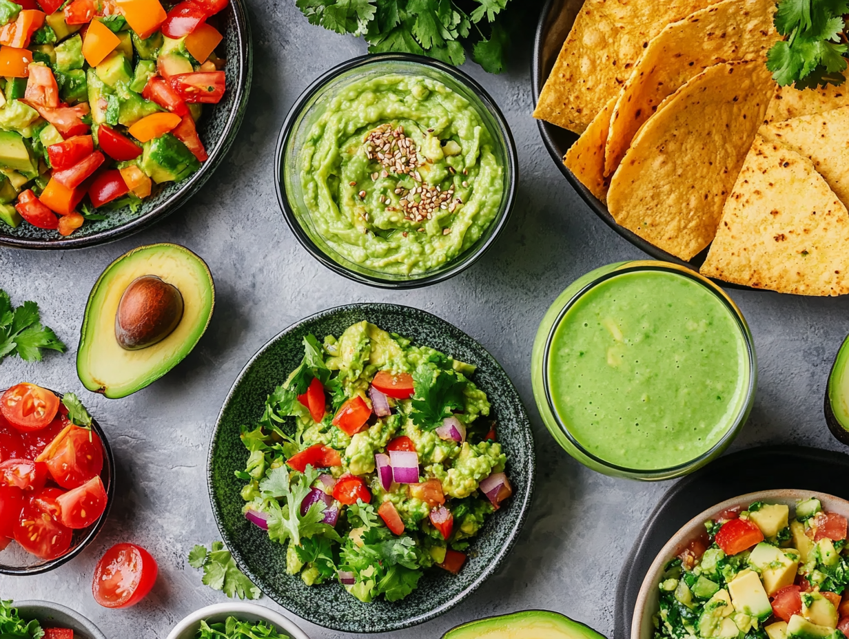 - 과카몰리: 으깬 아보카도에 토마토, 양파, 고수, 라임즙을 넣어 만든 멕시코 디핑 소스입니다.