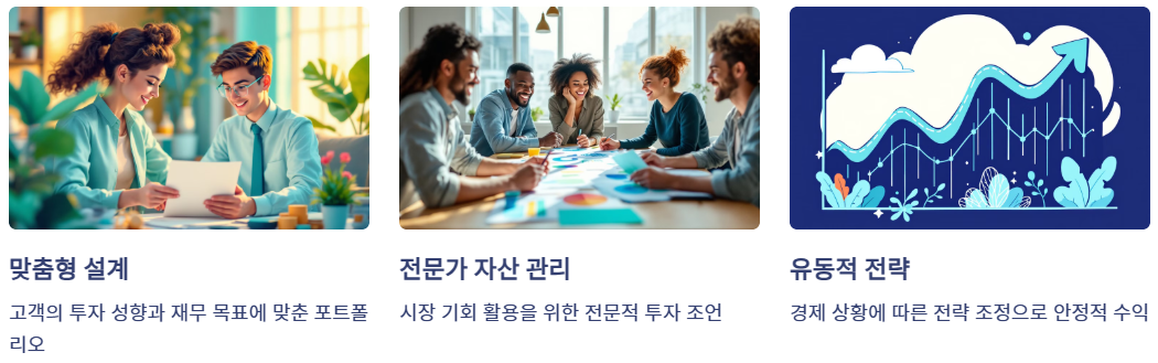 - 고객의 투자 성향과 재무 목표에 맞춰 맞춤형 설계가 가능합니다. 예를 들어, 안정성을 선호하는 고객은 채권 중심의 포트폴리오를, 공격적인 성향을 가진 투자자는 주식 중심의 포트폴리오를 구성할 수 있습니다.