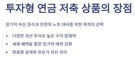 투자형 연금 저축 상품은 고객의 자금을 다양한 금융 자산에 투자하여 운용하는 상품으로, 고수익을 목표로 설계되었습니다. 이는 단순히 예금에 의존하는 것과 달리, 시장 변동성을 활용하여 장기적인 자산 성장을 목표로 합니다.