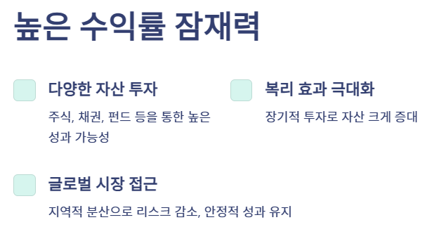 A: 높은 수익률 잠재력, 다양한 투자 옵션, 세제 혜택 등이 주요 장점입니다.